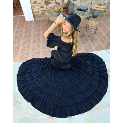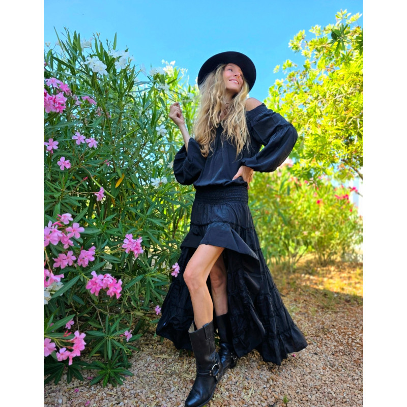 Indisches Seidenkleid mit langen Ärmeln und asymmetrischem Rüschenrock.