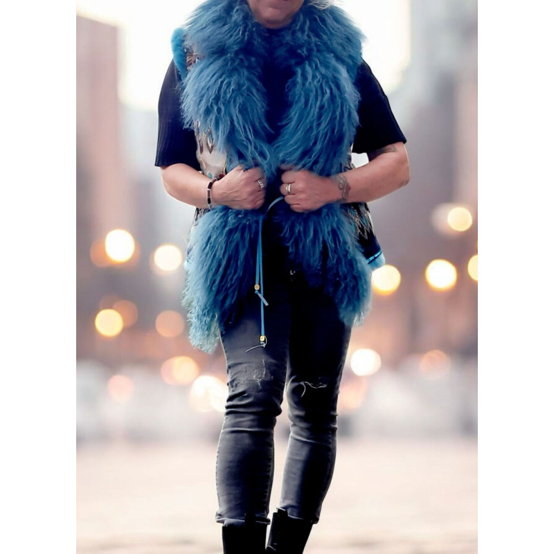 Die Weste wird mit Lederbändern geschlossen.