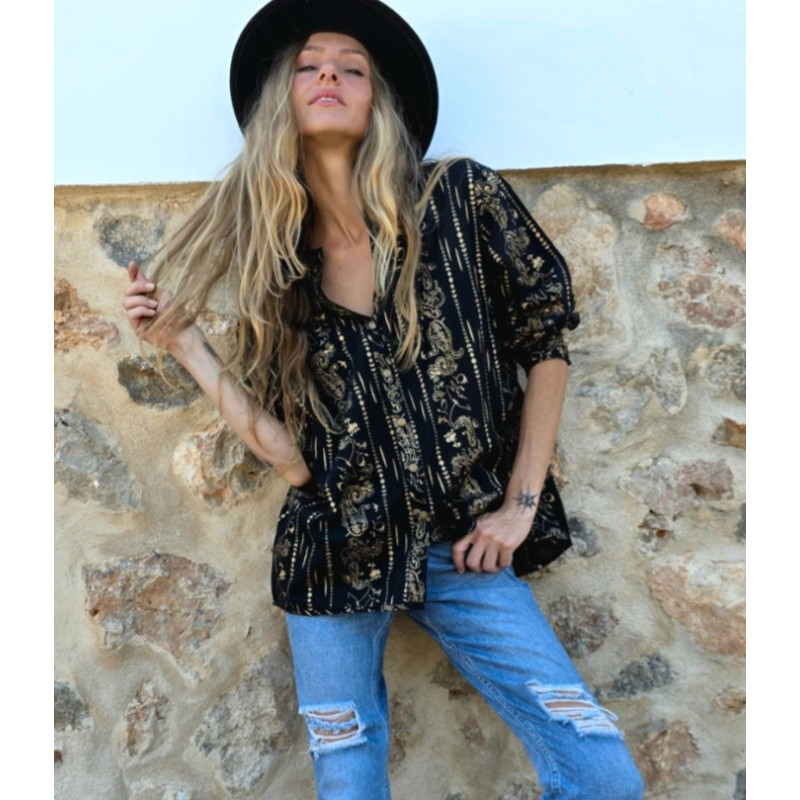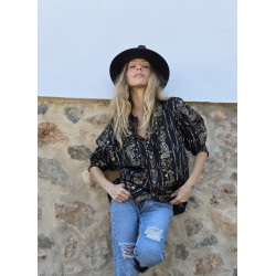 Aus schwarzer Baumwolle mit allover Print goldene Arabesken- und Mondmotiven.