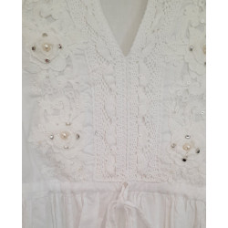 Boho Tunika Bluse Häkelspitze und mit Perlen bestickt im Dekolleté